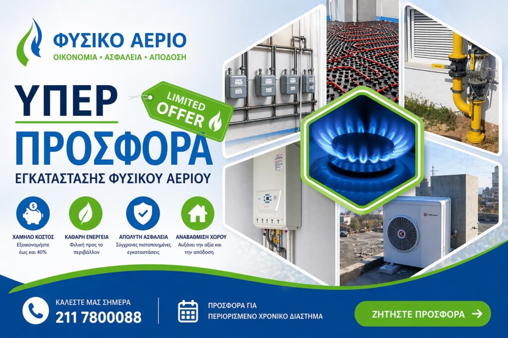 Παράλληλα, ειδικευόμαστε στις εγκαταστάσεις φυσικού αερίου, προσφέροντας ασφαλείς, πιστοποιημένες και ενεργειακά αποδοτικές λύσεις.
